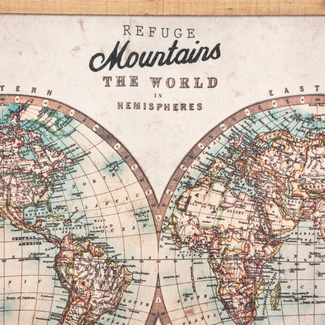 Tendue entre 2 baguettes, cette toile en lin imprimée en couleur est suspendue à une tringle en métal vieilli qui sera vissée au mur. À l’enseigne d’un refuge montagnard, cette toile imprimée mappemonde « Wild » fait rêver.