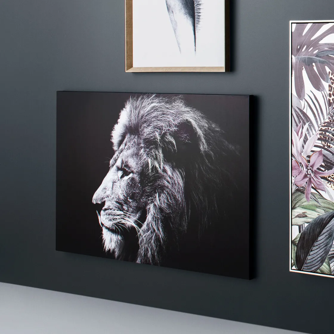 Ce portrait de lion doit son intensité aux contrastes noirs et blancs et à sa grande taille. Munie d’une structure en bois, cette toile rectangulaire rend hommage à la photographie animalière.