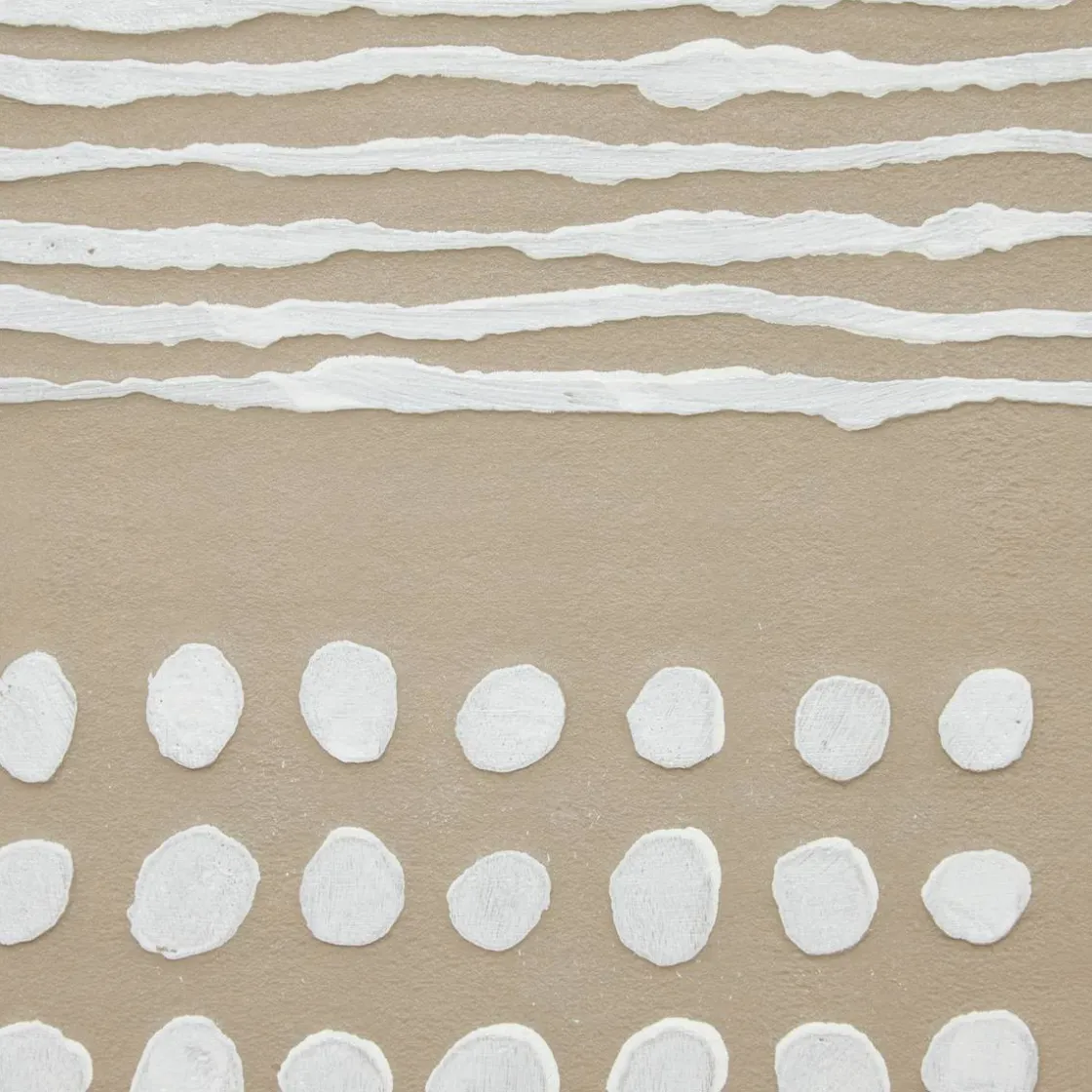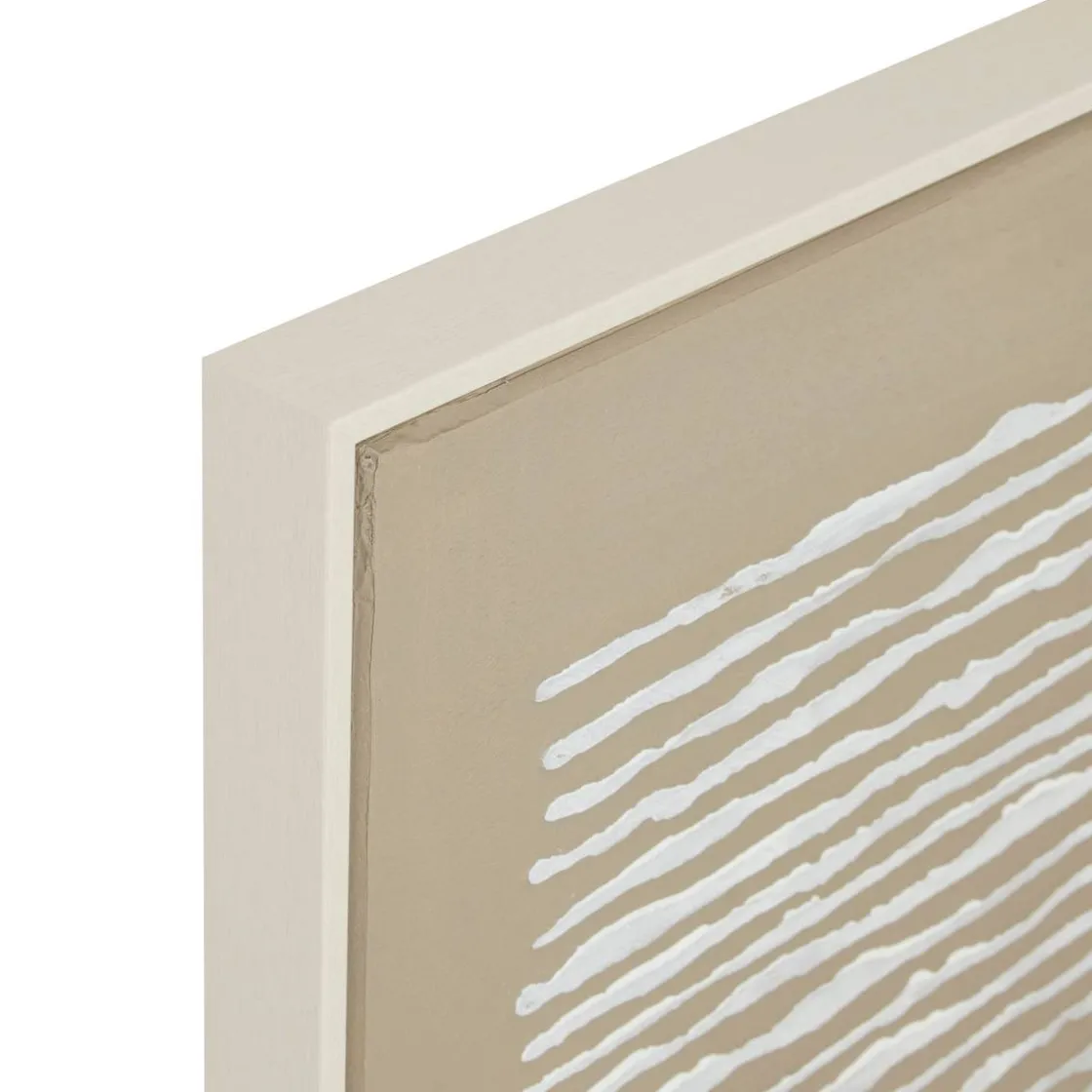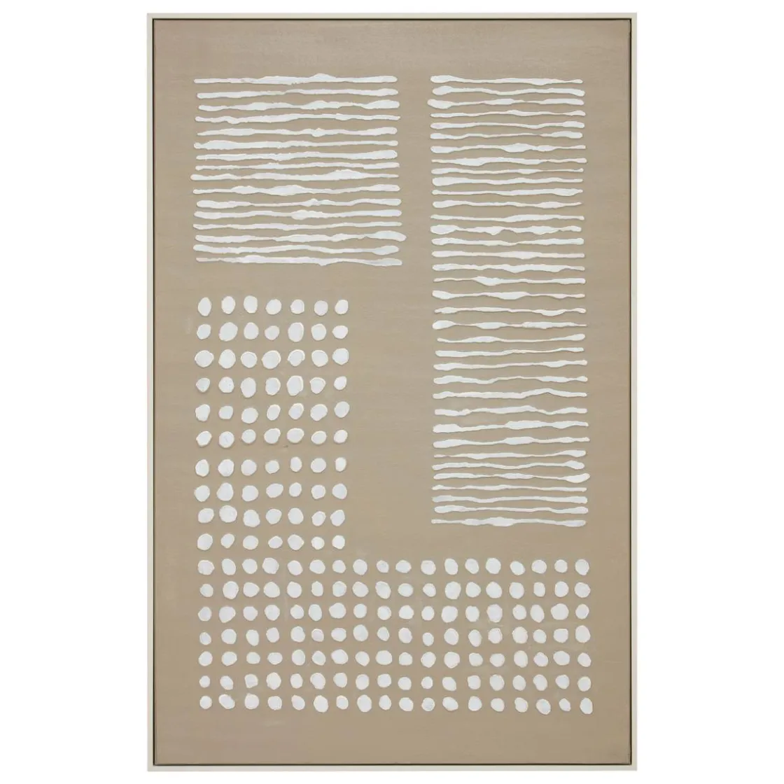 Contenue dans un cadre en bois certifié FSC®, cette grande toile rectangulaire est faite de motifs minimalistes réalisés à la peinture acrylique en relief. Elle trouvera naturellement sa place aux côtés de meubles en bois comme une console Atmosphera.