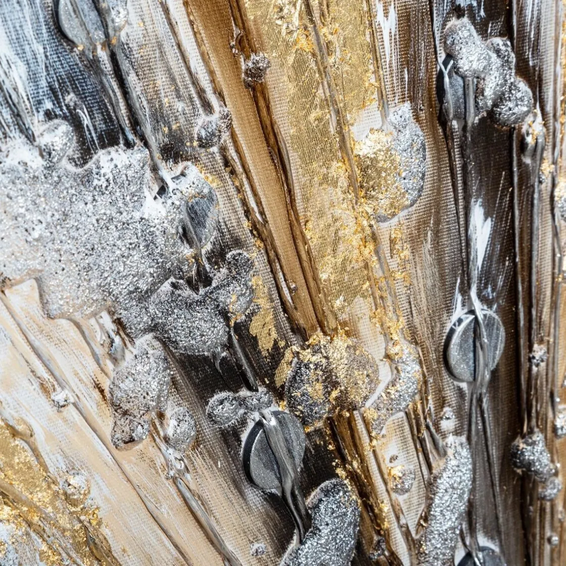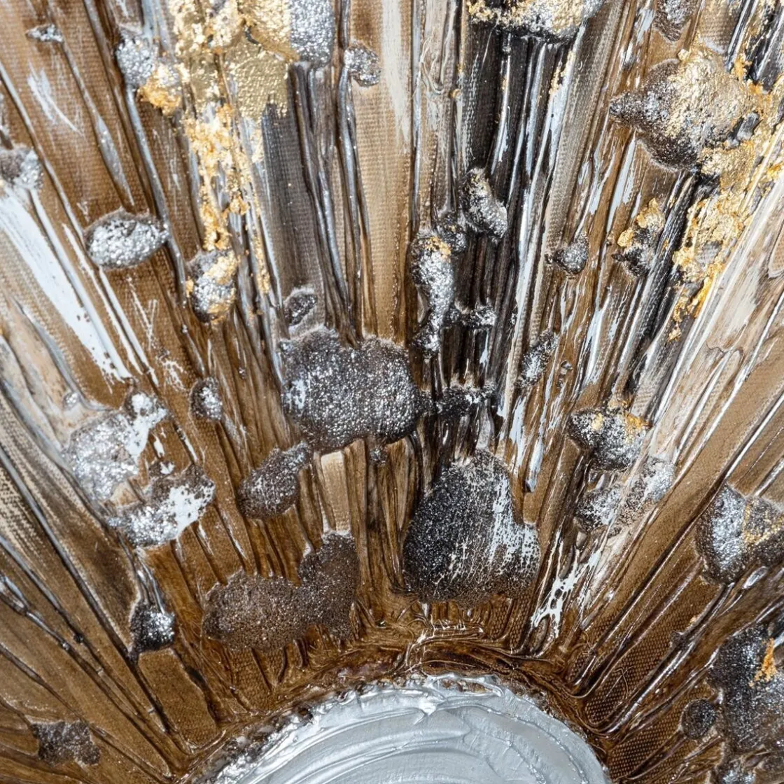 Décorée de bulles et de projections de peinture métallisée en cercle, cette peinture sur toile rectangulaire représente un astre en fusion. De style contemporain chic, la toile sur châssis « Kylia » sublimera votre pièce.