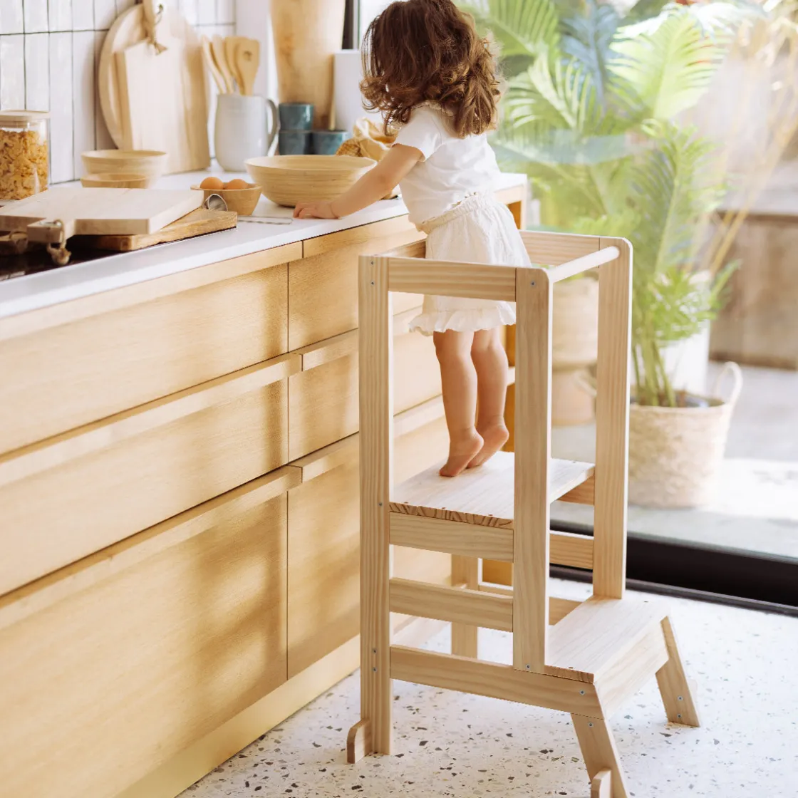 Escabeau à une marche avec plateforme sécurisée, la tour d’observation « Lea » permet aux tout-petits de se grandir pour participer aux tâches quotidiennes : préparer le repas, mettre le couvert, se laver les mains ou les dents devant le lavabo…