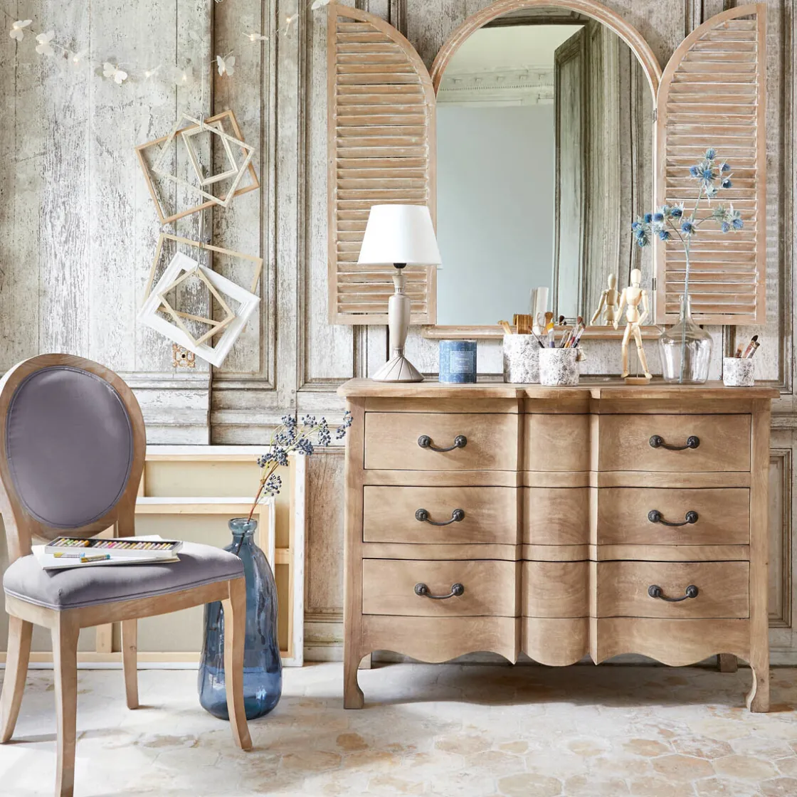 Pour un mix des matières réussi, déposez votre vase au sol, à côté d’une commode en bois exotique Atmosphera.