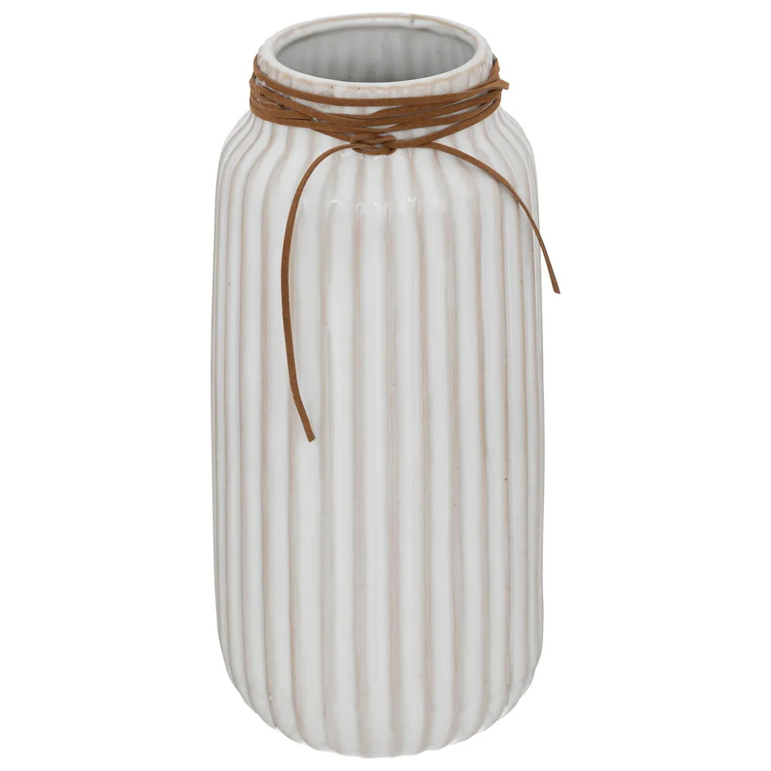 Ce vase en grès strié offre un fini très brut et son col est décoré d’un lien en cuir. Idéal pour accueillir des compositions de fleurs fraîches comme de tiges naturelles séchées, il se mariera parfaitement avec des matières comme le bois et la jute végétale. Mixez les matières et profitez d’un univers chaleureux!