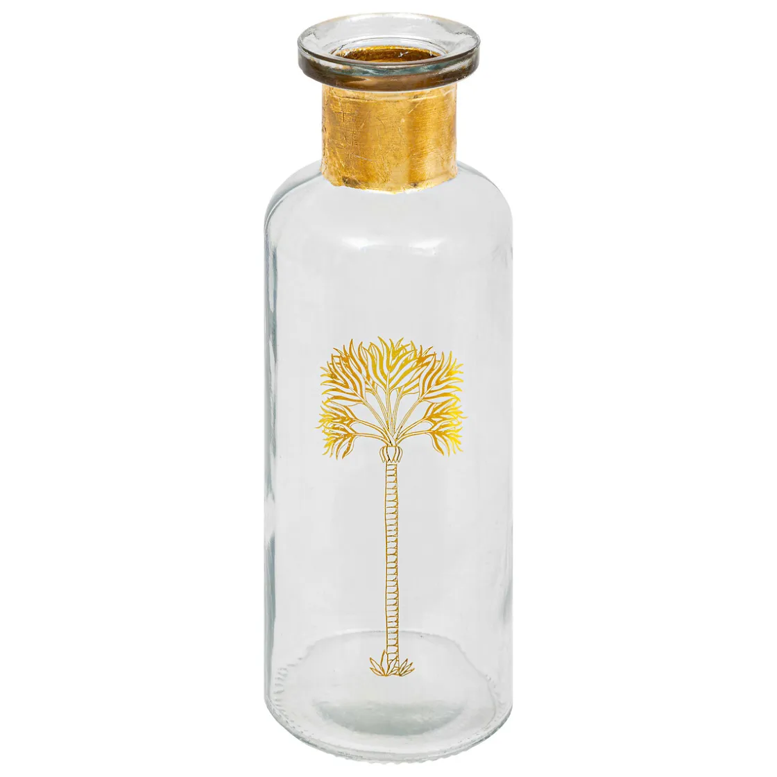 Réalisé en verre transparent, le vase bouteille « Tropical boudoir » obéit à des dimensions harmonieuses et vous permettra de mettre quelques fleurs fraiches ou tiges séchées en valeur. Rehaussé de motifs dorés très contemporains, il se suffira en tant qu’objet déco à part entière dans un univers à l’esprit décorateur!