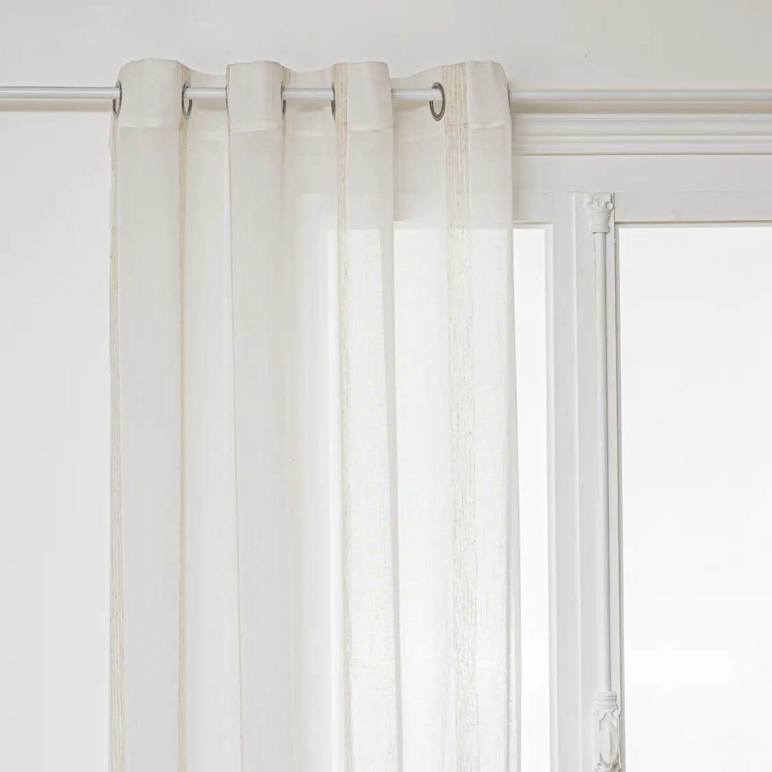 Réalisé dans un tissage de lin mélangé, ce voilage apportera de l’intimité dans une pièce dans occulter la lumière. Grâce à ses oeillets métalliques, vous pourrez le glisser sans effort sur une tringle et il habillera une grande fenêtre de manière très authentique.